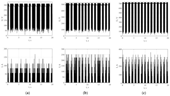 Typical oscillograms of current and voltage pulses of plasma-chemical pyrolysis of fuel oil at 300–700 V are shown in Figure 2.