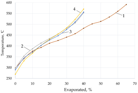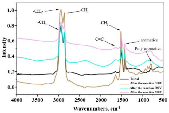 The fractional composition (Figure 3) of the initial fuel oil and still bottoms after NTP pyrolysis at 300–700 V was determined using simulated distillation (ASTM D7169). The results showed that the NTP pyrolysis process led to the production of heavier fuel oil (Table 3 and Figure 3) with increased stress and degree of conversion compared to the initial fuel oil. Additionally, the NTP pyrolysis process increased the boiling point of the products while reducing the proportion of volatile components from 69% to 43–44%.