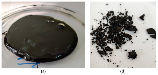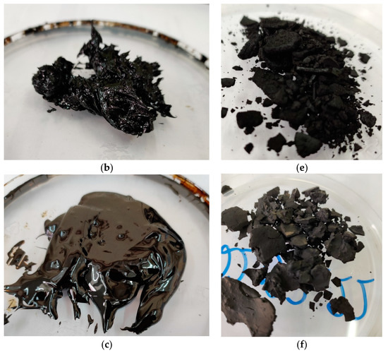 Figure 4a–c show photos of still bottoms and solid products (d–f) isolated from still bottoms after plasma-chemical pyrolysis of fuel oil. The heat of combustion of the solid product (Figure 4f) is 36,439.6 ± 187.2 kJ/kg.