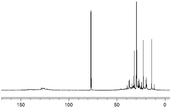 In the 13C NMR spectrum (Figure 6), the signals in the 115–155 ppm region correspond to aromatic carbon atoms, which belong mainly to condensed molecules. Signals of carbon atoms belonging to aliphatic fragments appear in the 5–60 ppm range.