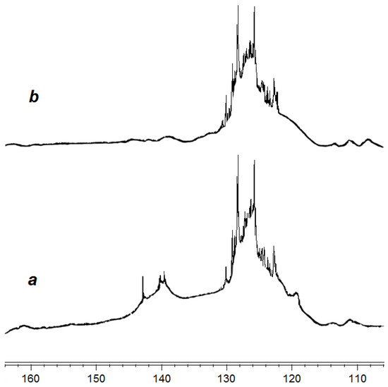 Signals 13C NMR in the 115–155 ppm range refer to aromatic carbon (Figure 7a). In the 13C NMR spectrum DEPT-135 (Figure 7b), the signals of aromatic hydrocarbons coupled with protons are presented, so there are no signals in the 135–155 ppm region related to condensed structures.