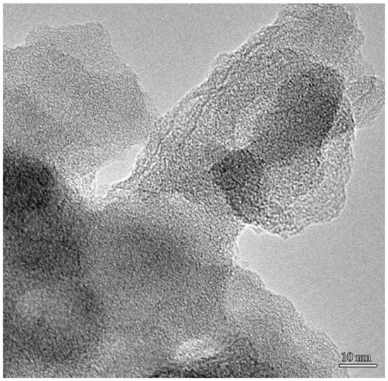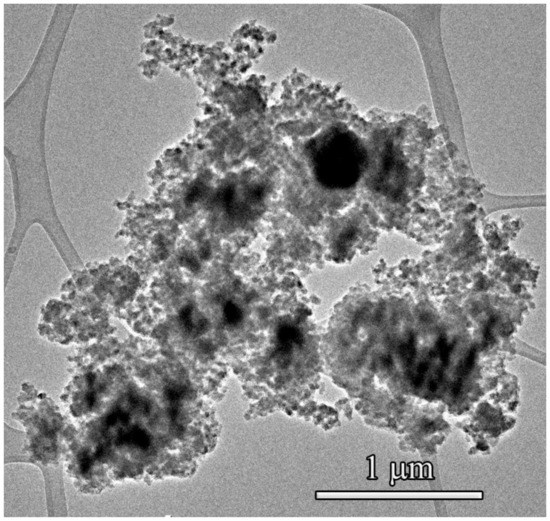 The solid products of the NTP pyrolysis of fuel oil are morphologically similar for the whole range of the power supply, namely 300–700 V. A typical low-magnification bright-field TEM image of a solid product of plasma-chemical pyrolysis of fuel oil at 700 V of demonstrates a particle conglomerate (Figure 8). The conglomerate consists of round-shape particles stacked together. The size of the particles ranges between one and tens of µm.