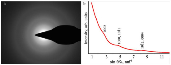A selected-area electron diffraction (SAED) pattern of the solid product of NTP pyrolysis (obtained at 700 V DC) and the histogram of radially averaged SAED are shown in Figure 9a,b, respectively. The SAED and the histogram indicate the glassy and/or nanocrystalline nature of the solid product of fuel oil pyrolysis. Several diffuse rings and corresponding maxima on the histogram are close to the 002, 100/101, and 102/004 hexagonal graphite interplanar distances.