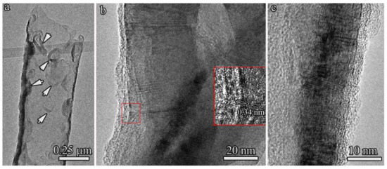 However, particles of other types, namely, graphite flakes and multilayer carbon nanotubes (MCN), were also found in the solid product of fuel oil pyrolysis, and TEM images of an MCN are shown in Figure 11a–c. Interestingly, the thickness of the wall is not uniform: the left wall (Figure 11b) is at least twice as thick as the right one (Figure 11c). Inside the tube, there are carbon flakes (see Figure 11a).