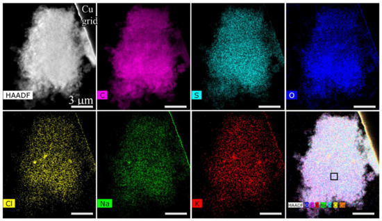After the inspection of the EDX spectra, elemental mapping was carried out, and the maps are shown in Figure 13. The maps demonstrate the uniform distribution of C, S, and O, and the compositional map confirms that Na and K form precipitates of NaCl and KCl.
