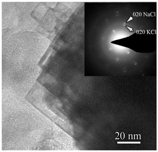 In some conglomerates, the nanocrystals were observed to exhibit cubic morphology (Figure 14). Surprisingly, the SAED pattern (see Figure 14 inset), together with EDX mapping (not shown here), revealed the mixture of NaCl and KCl nanocrystals.