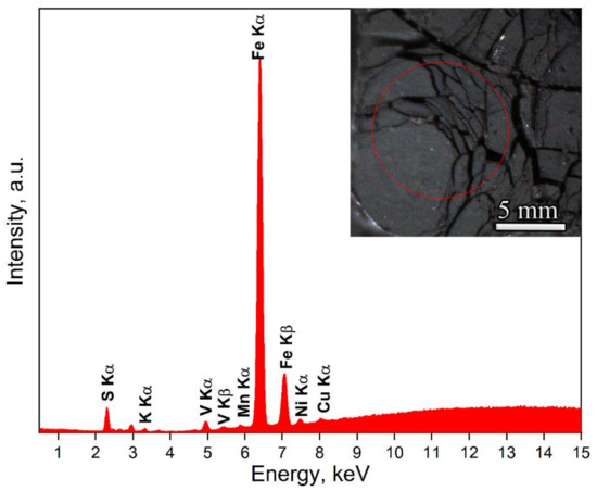 The X-ray fluorescence spectra are shown in Figure 15, and the quantitative results are presented in Table 7. These results were quite similar (within 5% accuracy) to other areas of the sample. The extremely high content of impurities in the solid product was due to the absence of C, O, and N in the spectra, which are not registered during X-ray fluorescence analysis. The high content of nickel and vanadium is associated with the concentration of the initial heavy oil [57].