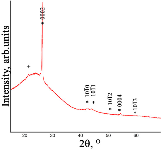 A diffractogram of the solid product of the NTP pyrolysis of fuel oil at 700 V is shown in Figure 16. The peaks from the graphite (2H graphite Space Group #194 P63/mmc, a = 0.2464 nm, c = 0.6711 nm) [58] are marked by asterisks. There is a good match of the most intense peak, which corresponds to the 0002 reflection of the graphite (at 2θ = 26.382°), but there is a slight discrepancy between the experimental peak and the 0004 reflection of cited graphite. That discrepancy could be explained by the high density of defects in the material. The reflection marked by the cross at 2θ = 21.342° (see Figure 15) matches with sodium stearate’s (C18H35NaO2 PDF-2 00-001-0418) most intense peak. The estimation of the average size of graphite crystallites according to the Scherer formula for the 0002 main peak with a half-width of 0.2° corresponds to ~50 nm. At the same time, this character of the spectrum can be associated with the superposition of reflections from C5H10O2, C29H60 and C14H28 compounds as well as asphaltene [59,60] compounds.