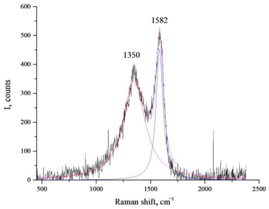 The Raman spectrum (Figure 17) of the solid product of the NTP pyrolysis of fuel oil at 700 V has broad peaks with the maximum positions at 1350–1360 cm−1 and 1580–1583 cm−1. Peaks with maxima around 1350 cm−1 are characteristic of disordered graphite and are denoted by the letter D (disordered).