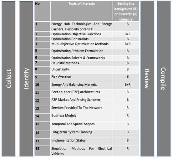 - Identify a list of topics of interest to focus on. The EH concept is a multi-faceted research question that entails different topics to be further investigated. Therefore, an exhaustive list of 18 topics of interest that are related to EHs has been developed. Within this list, the topics have been further categorized as “setting the background” topics or/and “research and innovation” topics. Background topics are the ones that formulate the state of the art of this review and establish the baseline knowledge of this effort, whereas “research and innovation” topics are classified as such to formulate further innovation pathways and the research questions that are analyzed in detail. Of course, a topic can be characterized as both “background” and “research and innovation”;