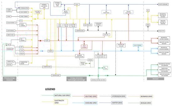 The basic idea of an integrated energy system is to switch from a single energy carrier to multiple energy carriers to take advantage of the synergistic effects of interactions to increase the efficiency of the energy resources used [2]. The integrated energy systems concept was introduced in the European Technology & Innovation Platforms Smart Networks for Energy Transition (ETIP SNET) Vision 2050 [3]. Their main feature is the integrated management of various carriers beyond electricity including heating, cooling, hydrogen, and mobility. In detail, this system can be seen as a “system of systems,” where various energy carriers coexist in an integrated infrastructure that is supported by the electrical system. Therefore, electrical networks are coupled with gas, heating, and cooling networks and this integration is made possible through energy conversion processes and storage of different types. This sector coupling is related to both the linking energy carriers with each other, and to end-use sectors including residential, tertiary, industry, and transportation. With this in mind, different types of energy technologies are managed with strong synergy to meet multi-energy needs, and the services can be supplied by the most convenient sector and related carrier. In addition, the increase in efficiency in the use of energy resources achieved thanks to the exploitation of synergies among energy carriers can lead to the reduction of renewable energy sources (RES) curtailment [4]. For instance, power-to-X technologies can act as a reservoir for excess electricity, using available energy in a cyclic and cost-effective manner. Integrating electricity and gas/hydrogen sectors (power-to-gas, power-to-hydrogen) will help exploit and retrofit existing gas infrastructures for renewable energy transport, thereby reducing the needs to expand power transmission through the storage of gas to deal with the seasonal changes in supply and demand of renewable energy. In fact, the gas generated with RES can be a resource as a low-carbon back-up capacity to supply electricity in power plants or fuel cells when there is no availability of other RES. Power-to-heat technologies such as heat pumps (HPs) allow achieving efficient heating and cooling processes of buildings from both energetic and economic points of view through the reduction of primary energy consumption. If thermal storage is coupled with HPs, it could allow for a change in thermal energy production in the event of an excess of renewable electricity.