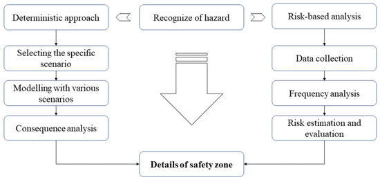 In terms of risk assessment, there are two main approaches to defining the safety zone during the ammonia bunkering process: the deterministic approach and the risk-based approach. The appropriate approach should be selected based on the target bunkering scenario [25]. Normally, for standard scenarios, such as port-to-ship, ship-to-ship, truck-to-ship, and a portable ammonia fuel tank, a qualitative approach (deterministic approach) is employed [26]. A quantitative approach (risk-based approach) is preferred for other scenarios. The spirit and theory of these two approaches are described below in Figure 1. Considering that the ammonia facilities under discussion often use basic methods, the possibility of an ammonia leak during bunkering can be examined using a single scenario. The representative scenario is delineated using the worst-case or specified conditions, and the necessary safety distance surrounding the facility is then roughly computed, taking into account the flammability range and dispersion characteristics.