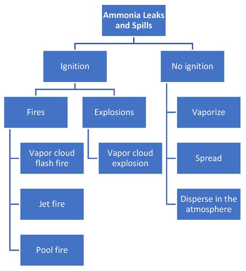 The widespread application of ammonia in the industrial sector has led to significant consequences for society, property, the environment, and facilities, particularly during unexpected incidents. According to statistics, from 1985 to 2019, there were approximately 71 accidents involving anhydrous ammonia. The primary causes of deaths and injuries were identified as inhalation of the gas or fires [41]. Chemical-based hazards have a high percentage of injuries, fatalities, and evacuations, which is in line with the alarming number of serious incidents caused by ammonia leaks. Accidents involving ammonia explosions and dispersion can be caused by various factors, such as mechanical failures, operational difficulties, and human error.