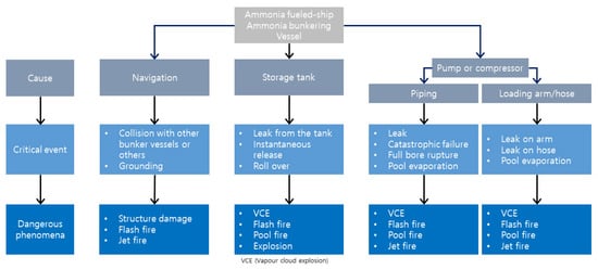 As for the ammonia bunkering process, the accidents that may occur as a result of ammonia leakage and release are shown below in Figure 4. In the case of ammonia leakage or a spill, the accident outcomes consist of vapor cloud explosion (VCE), flash fire, pool fire, jet fire, and explosion [60]. When released, ammonia that has been kept at a pressure that is significantly higher than the atmospheric pressure will partly flash (rapidly evaporate) [61]. Additional event outcomes, such as fireballs, rocket fires, and BLEVE (boiling liquid expanding vapor explosion) are expected as a result [62]. Further developments include dispersion without fire, fire, and explosion. These three possible scenarios, identified from the literature review and field experiments, are reflected in each of the following trees [63]. The materials cited in this article may contain actual instances of these occurrences.