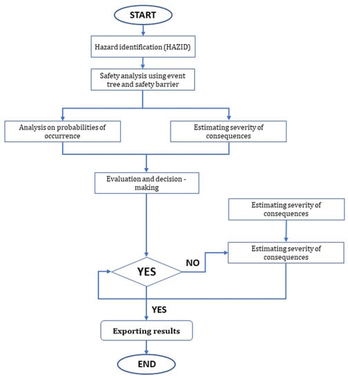 It is obvious that some level of social cost will be incurred during the ammonia bunkering process. Humans might suffer blindness, lung injury, or even death as a result of exposure to deadly ammonia gas, which also causes burning of the eyes, nostrils, throat, and respiratory system. In addition, it is important to note the dangers posed by ammonia’s flammability. Ammonia is being investigated as a maritime propellant, but not much information is available as of yet. There have been few studies investigating the dangers of using ammonia as fuel for transportation. Figure 6 presents a computational algorithm and procedure of risk assessment.