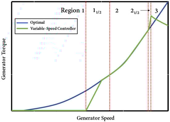 Generally speaking, there are two control loops to control a wind turbine, namely torque control loop and pitch control loop [2]. Figure 1 shows that, depending on the wind speed, the control of a wind turbine may be roughly split into three phases, i.e., the standby segment, the optimal Cp segment, and the rated power segment. The green line depicts the turbine’s actual operating curve, while the blue line shows that the turbine is running at its ideal blade tip speed ratio. Region 1 denotes that the turbine is in standby mode, since the wind speed is too low to generate electricity, with the rotational speed rising and the torque at 0. Region 2 is the optimal Cp section, where the blade tip speed ratio is ideal and the turbine has not yet reached its rated output. The turbine is controlled to maintain constant power by altering the pitch angle and generator torque in Region 3, which shows that the turbine has reached rated power and that the rotational speed is inversely proportional to the torque. Area 11/2 indicates the start-up state and area 21/2 the transition state where the rated power is about to be reached, these two areas account for very little. The region 2 is under power operation. To utilise wind energy as much as possible in this operating region is the control aim. At this stage, the blade pitch angle is locked at the optimal value in order to optimize power production, and the torque control circuit is used to adjust the rotor speed to run relatively near to the ideal speed. Numerous control techniques, including tip speed ratio (TSR) control [3], optimal torque control [4], power signal feedback control [5], and extremum seeking control [6], etc., have been researched and used in this sector. However, their characteristics include a slow tracking speed and that tracking accuracy cannot be set in advance.