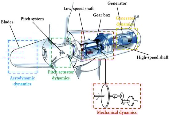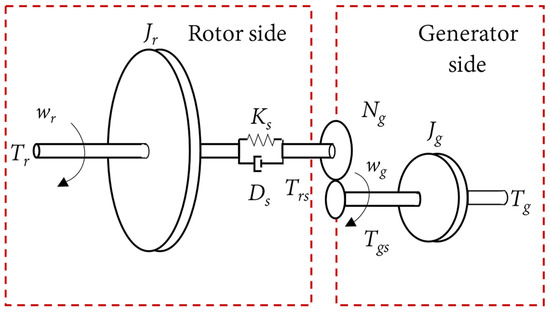 A wind turbine is made up of four basic parts, including aerodynamics, mechanics, a generator, and a pitch actuator, as depicted in Figure 2. The two discs on the left and right in Figure 3 are the determinant of inertias, and . In other words, and represent the rotor’s and the generator’s respective rotational inertia. The rotation of the rotor shaft at high torques is described as a mass-spring system with damping and a spring constant . In addition, and stand for the torque on each side of the rotor and generator, respectively. The transmitted torques and are interconnected via the gear ratio .