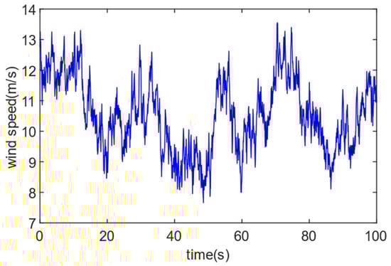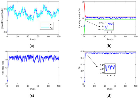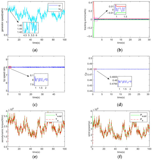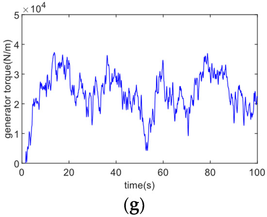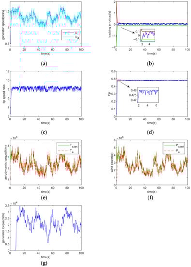 Figure 6 shows the turbulent winds with effective speed being 10 m/s. Figure 7 displays the controller’s tracking performance for tracking accuracy and convergence time . In Figure 7, (a) shows that the control method achieves sensitive tracking of the generator speed against the optimal generator speed under random fluctuations in wind speed; (b) demonstrates that the tracking error achieves the control goal of error tracking by converging to the required accuracy range in the provided convergence period t = 2 s; (c) demonstrates how the tip speed ratio is kept to vary about the ideal value even after the tracking error has converged to the defined range; (d) demonstrates how the rotor power coefficient is maximized and the greatest amount of wind energy is captured by altering the tracking wind turbine’s ideal speed; (e) and (f) show that the control method enables fast tracking of its optimal trajectory by aerodynamic torque and wind power; (g) shows that the speed is varied by adjusting the generator torque to cope with wind speed variations. Fast tracking is accomplished via the control approach.