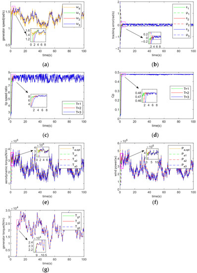 Tracking performance at fixed ε = 0.1, T for 1, 2, and 3 respectively. (a) Generator speed; (b) Tracking error; (c) Tip speed ratio; (d) Rotor power coefficient; (e) Aerodynamic torque; (f) Wind power; (g) Generator torque.