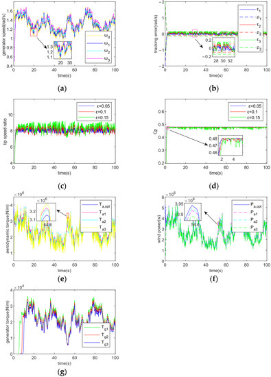 The system’s impact on tracking accuracy is then confirmed. Figure 9 demonstrates the control performance of the controller for fixed convergence time = 2 and varying the tracking accuracy of the controller to 0.05, 0.1 and 0.15 respectively. (a) shows that the magnitude of the tracking accuracy affects the sensitivity of the generator speed to the optimal generator speed trajectory tracking, the tracking is more sensitive and precise when is smaller, where , , and are the turbine speeds at tracking accuracy = 0.05, 0.1, and 0.15 respectively, and is the desired turbine speed; from (b) it is clear that the magnitude of the tracking accuracy affects the final convergence range of the tracking error, tracking accuracy is increased by decreasing the , where the values of , , and are 0.05, 0.1, and 0.15, respectively, and , , and are the corresponding performance bounds at different tracking accuracies; (c) and (d) show the different fluctuations of the blade tip speed ratio and rotor power coefficient around the optimal value at different tracking accuracies, the larger the , the greater the fluctuation amplitude, and vice versa, the flatter the fluctuation amplitude; (e) and (f) show that the smaller the tracking accuracy , the higher the coincidence of optimal aerodynamic torque and wind power trajectory tracking, i.e., the higher the tracking accuracy; (g) shows how the smaller the tracking accuracy , the more sensitive the regulation of the generator torque and the greater the regulation when the wind speed changes rapidly.