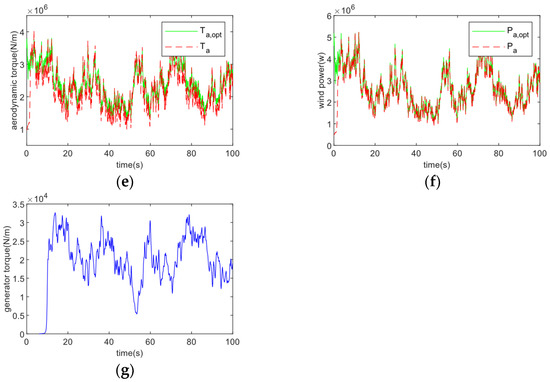 Subsequently, we varied the parameters of the controller so that , to verify the effect of different parameter combinations on the performance of the controller. Figure 11 shows the tracking performance when , . Figure 11 compares with Figure 7 as well as Figure 10. The corresponding panel (a) show a decrease in the sensitivity of the turbine speed to the desired trajectory tracking and a decrease in trajectory coincidence after increasing the tracking accuracy and convergence time T. Panel (b) shows a slowdown in the convergence of the tracking error to within a given accuracy range, with a larger accuracy range leading to a decrease in control accuracy; panels (c) and (d) show controller parameter combinations show a significant increase in the fluctuation of the leaf tip speed ratio and rotor power coefficient around the optimum value. It can be seen that the selection of suitable controller parameters is crucial to improve the control effect; (e) and (f) show a reduction in sensitivity to optimal trajectory tracking of aerodynamic torque and wind power after increasing the convergence time and tracking accuracy ; (g) shows the slower and less regulated involvement of the generator torque in the regulation. Choosing the right controller parameters is crucial.