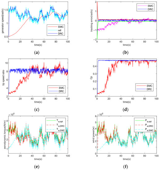 It is clear from Figure 12 that the DRC controller is more effective. (a) and (b) show that under the strong disturbance of external perturbation, the DRC control makes the tracking error converge quickly to the specified accuracy range, achieving sensitive tracking of the required speed trajectory and ensuring the best speed of the generator, while the tracking error under the SMC control gradually maintains stability after 35 s and the fluctuation amplitude exceeds the given accuracy range; (c) and (d) show that the DRC controller is able to track the TSR more accurately and quickly, and achieves the tracking of the optimal tip speed ratio within the preset time of 2 s, so that the rotor power coefficient reaches the maximum value to obtain the best wind power and achieve the control targets, while the SMC controller has a slower tracking speed and the control effect is unstable, and the TSR and Cp fluctuate more around the optimal value; (e) and (f) show that the DRC controller is more responsive to rapid changes in wind speed than the SMC controller, enabling maximum capture of wind energy by maximising aerodynamic torque and wind power within a pre-given time of T = 2 s.