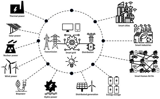 Novel technologies such as the distributed energy resources (DERs) also provide many possibilities for smart grids that allow power generation at a local level instead of relying on large and centralized power plants [59,60]. This is an important change that can result in improved environmental performance and increased efficiency from renewable energy sources. In addition, these distributed systems also increase security by making it harder for malicious actors to disrupt the electrical grid or cause blackouts due to cyber threats or physical attacks on substations [61,62]. Sufficient smart grid systems are needed for ensuring reliable access to electricity for all consumers and businesses across the world. Smart grid technology is used to monitor the transmission and distribution of electrical power using advanced digital technology. This allows for two-way communication between utilities and consumers, providing them with insight into their energy use. Smart grids also allow for two-way flow of electricity by enabling electricity to be transmitted from both sources (utilities and consumers). This helps reduce the demand for utilities by allowing them to better manage their resources [63,64,65]. Additionally, smart grids can be equipped with various sensors that can detect any faults or problems with transmission lines or other elements of the grid infrastructure. This might help the utilities to quickly identify and resolve any outages or problems in a timely manner [66]. Modern power systems are transitioning towards flexible and intelligent smart grids to make energy distribution more efficient. The introduction of new technologies offers the utilities the ability to integrate renewable energy sources into their existing energy systems, increasing grid efficiency and allowing for variable renewable energy generation. Smart grids also allow for better control of power flows, enabling better management of intermittent renewable sources. In addition, communication technologies are used to enhance the efficiency of the grid itself by enabling faster response times and higher levels of accuracy in monitoring system performance [67,68].
