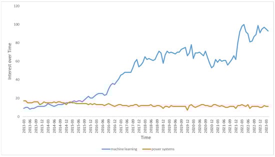 The dynamics of frequency of search requests (Interest over Time—search interest relative to the highest point on the chart for the given region and time and ranging from 0 (zero popularity on no data) to 100 (peak popularity) of the concepts of “machine learning” and “power systems” around the world (2013–2023). Source: Own results based on Google Trends [169].