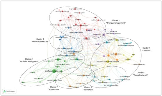 Figure 4 below shows the results of the network map based on the text data. In total, seven main clusters were identified. The analysis of using key words and phrases in the publications retrieved from WoS revealed that terms connected with “machine learning” and “power systems” are most often related to the following: (1) energy management (Cluster 1); (2) artificial intelligence (Cluster 2); (3) anomaly detection (Cluster 3); (4) classifier (Cluster 4); (5) neural network (Cluster 5); (6) blockchain (Cluster 6); (7) automation (Cluster 7).