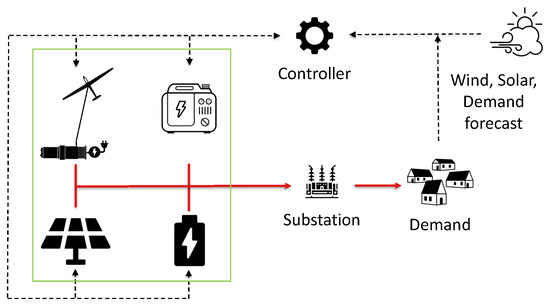 The objective of this paper is to develop a modelling and sizing framework for HPSs using AWE for remote off-grid applications. A schematic representation of the investigated HPS architecture is shown in Figure 1. The considered components are AWE systems, solar photovoltaic (PV) panels, diesel generators and rechargeable batteries. A controller optimises the dispatch of electricity based on wind, solar and demand forecasts. The solid red lines represent power transmission cables, and the dotted black lines represent communication channels.