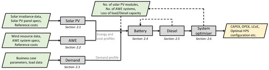 Figure 2 shows a flow chart of the developed framework for the modelling and sizing of a hybrid power system (HPS). The framework has six independent modules of solar PV, AWE, demand, battery, diesel and the system optimiser, which are coupled. Solar PV and AWE are considered the primary energy sources, whereas the battery system and the diesel generator are the secondary components of the HPS. The primary function of the framework is to appropriately size the HPS components with the objective of minimising the cost of electricity while supplying the demand at all times. The framework functions in two stages in every iteration, as depicted by the dashed lines. The first stage consists of varying the number of solar PV modules and the AWE systems. In the second stage, the battery and diesel generators are appropriately sized based on the chosen number of solar PV modules and AWE systems. These iterations are repeated in the input design space to search for the optimal HPS configuration.