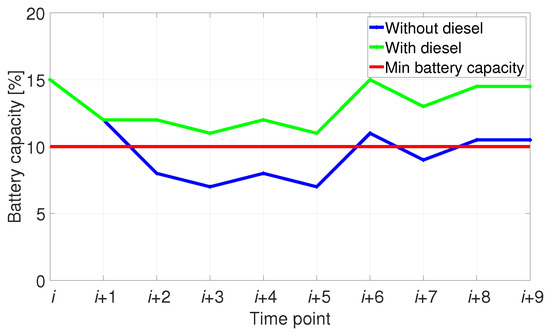 Example evolution of the battery capacity for an HPS with and without diesel.