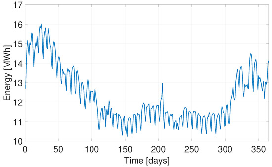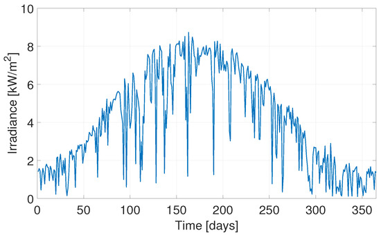 The daily irradiance level in Marseille in 2019 is illustrated in Figure 4, which is the sum of the 24 hourly irradiance levels during one specific day. The actual raw data used in the calculations have an hourly resolution. However, for visualisation purposes, the graph shows the daily irradiance levels. As expected, the highest irradiance levels occur in summer (in the middle of the year). The irregular drops in the irradiance are due to intermittent cloud cover occurring throughout the year.