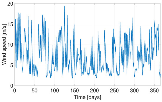 The daily average wind speed in Marseille in 2019 is shown in Figure 5. The hourly raw data were used for calculations, but the average daily wind speeds are shown for the purpose of visual representation. On an hourly time scale, the data show considerable variation, which is due to the inconsistent nature of the resource. On an annual basis, the wind speeds in the winter were slightly higher than in the summer. The average wind speed in Marseille in 2019 was 7.2 m/s.
