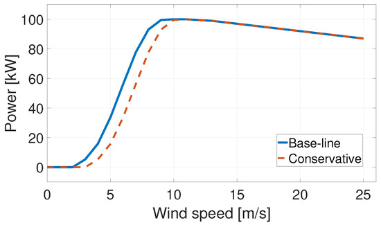 A 100 kW system based on the soft-wing ground generation concept was chosen as the AWE component in the framework. The cost data were obtained from Kitepower B.V. [37] under a non-disclosure agreement with the company. The power curve was computed with the AWERA toolchain [38] using key high-level system specifications provided by the company. These system specifications include the aerodynamic performance of the kite for the reel-out and reel-in phases; masses of the kite, the kite control unit and the tether; the wing surface area of the kite; the minimum and maximum tether lengths; the tether diameter; tether drag; and a maximum tether force limit. The toolchain is based on optimisation of the operation of the AWE system using a quasi-steady model [39] incorporating the effect of vertical wind shear profiles. A representative vertical wind shear profile was composed using eight profiles based on the ERA5 reanalysis data [40] via a clustering process described in [24]. Figure 7 shows the power curve of the system with a cut-in wind speed of 2 m/s and a maximum operating wind speed of 25 m/s. The solid line shows the baseline simulation results, and the dashed line shows a conservative estimate of the power curve. More energy is required during the reel-in phase of the cycle at higher wind speeds, since it has to overcome a larger drag force. Hence, the net cycle power drops with increasing wind speed after reaching the generator-rated power. The average operational height of the system was 320 m. The conservative estimate accounts for uncertainty in the estimation of the kite mass, which is one of the primary factors affecting the system performance at lower wind speeds. Heavier kites shift the power curve to higher wind speeds.