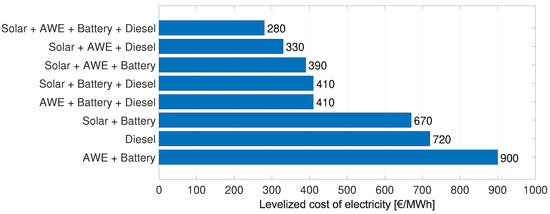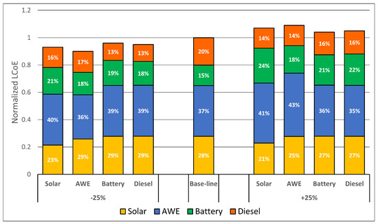 Figure 9 illustrates the results from the performed sensitivity analysis. The bar graphs show the cost distribution of the HPS configurations. The total costs per component include the CAPEX and the discounted OPEX over the entire lifetime of the HPS. The baseline configuration is the optimal configuration presented in Table 3. A cost variation of on every component of the HPS configuration is applied to observe the change in the cost distribution of the resulting optimal HPS configuration. For example, the first bar graph on the left of the baseline scenario is the result of decreasing the cost of diesel by and keeping the costs of other components constant. Decreasing the cost of diesel, battery, AWE and solar PV by individually reduced the LCoE of the resulting optimal configurations by and , respectively. Increasing the cost of diesel, battery, AWE and solar PV by individually increased the LCoE of the resulting optimal configurations by and , respectively. The change in the cost of individual components by influenced the LCoE by only 4–10%. This shows that an HPS can efficiently accommodate the cost uncertainty of a certain component by sizing the components differently, demonstrating the robust nature of an HPS against a stand-alone single power generation source. Additional sensitivity analysis was performed in [18] by varying the costs by .
