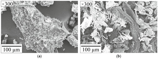 Figure 2 presents SEM images of particles of the studied samples of peat and pine sawdust obtained via scanning electron microscopy using the JSM-6000C microscope (JEOL, Akishima, Japan).