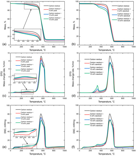 According to Figure 4, the intensive oxidation of the samples of waste tire pyrolysis carbon residue took place in the temperature range 510–636 °C (Ti and Tf, respectively (see Table 6)). Adding peat has a significant impact on the completeness of the oxidation of this mixture. So, an increase in the fraction of peat to 15% in the mixture led to an increase in the ash mass of 4.1%. The reason for this is the large ash content of the peat compared to the studied carbon residue (22.8 and 15.5%, respectively). The addition of sawdust did not have a significant effect on the completeness of its oxidation (Table 6).