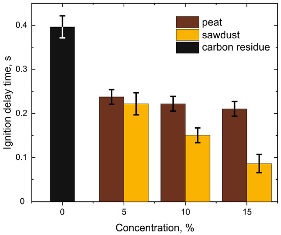 According to Figure 5 data, an increase in the content of biomass in the form of peat and pine sawdust in the fuel composite led to nonlinear reduction in the ignition delay times in comparison to the reference sample of waste tires pyrolysis carbon residue. The introduction of 5 wt% of either peat or sawdust additives resulted in a sharp drop of ignition delay time by approximately 40% from ~0.4 s to 0.24 s. The difference between peat and sawdust at such a concentration was insignificant. Further increasing peat additive concentration did not result in a strong effect on ignition delay time; the sample with 15 wt% of peat produced a smaller ignition delay time than the sample with 5 wt% by less than 5%. In contrast, increasing the concentration of the sawdust additive from 5 wt% to 15 wt% resulted in an approximated 2.5-fold decrease in the ignition delay time. Compared to the initial sample, the strongest effect was achieved when adding pine sawdust (from 44 to 78%, depending on the content). The reducing of the τi parameter was explained by an increase in the reactivity of this mixture due to the significantly higher content of volatile substances (by 9.4 wt%), lower moisture content (by 2.9 wt%), and the higher overall ignition reactivity of sawdust (Table 5). The latter could be caused by the higher content of hemicellulose and cellulose in sawdust compared to peat, which has a high content of the less reactive lignin.