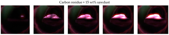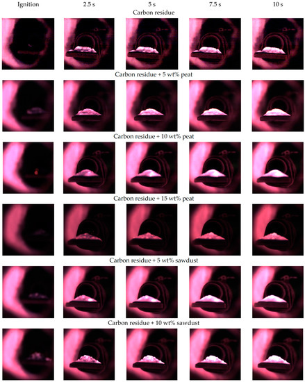 Figure 6 presents typical frames of ignition and the consequent combustion of the fuel samples. Several stages of the combustion process could be distinguished using the presented images. The first ones, which are usually distinguished in literature [30]—inert heating and moisture removal—are not presented in Figure 6. The latter stages—simultaneous releasing and combustion of volatile matter with solid carbon oxidation—took place at the moment of ignition. The ignition in this case could be characterized by the following mechanism: volatile matter (mainly consisting of substances of organic origin such as hemicellulose, cellulose, and lignin) form a gas cloud in the vicinity of the fuel sample, which heats the fuel and thus promotes the stable fuel combustion. The results are in good agreement with the thermal analysis data (Figure 4), which revealed an additional exothermic reaction of the organic component decomposition in the low temperature zone. The glowing at the moment of ignition was localized either at the top or in the bulk of the sample. This indicated the significant contribution of both heterogeneous reactions on the sample’s surface and homogeneous reactions in its vicinity. Intensity of glowing increases with time and its distribution becomes more uniform. While the contribution of gas-phase reactions near the sample surface increases with the volatile matter content in the mixture, the glowing distribution for the samples with higher content of additives was more uniform. However, this effect was quite weak.