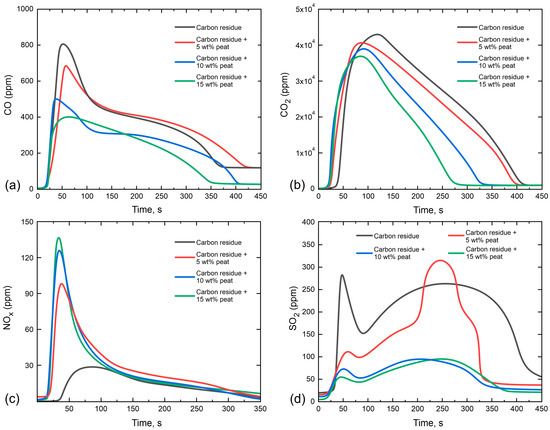The concentration profiles of sulfur oxide had a bimodal form with an obvious trend of reducing emissions with an increase in the fraction of biomass components. The greatest effect was achieved at the carbon residue combustion stage and was expressed in both the general narrowing of the emission range (starting from 5 wt% of peat additive) and the decreasing of the peak concentrations. Moreover, it was observed that at higher concentrations of peat additive, these effects were stronger. The reduction in concentration of sulfur oxides was caused by its binding and conservation in solid form into ash residue [22].