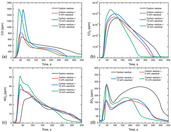 Dependences of the gas-phase combustion products release on time for the studied samples of waste tire pyrolysis carbon residue and fuel composites with pine sawdust additive: (a)—carbon monoxide; (b)—carbon dioxide; (c)—nitrogen oxide; (d)—sulfur oxide.