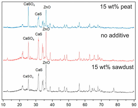 The XRD-spectra for ash formed after the combustion of the initial and modified fuel composites (with 15 wt% peat and pine sawdust additives) are presented in Figure 9. The results observed allow us to identify that the major components of ash were calcium sulfide, calcium sulfate, and zinc oxide. While Ca is widely considered to be one of the major components of ash residue of many different types of biomasses, it is usually considered to present in the form of oxide [31]. However, regarding coal–biomass blends, several instances of sulfur-containing solid-phase products in the form of CaS and CaSO4 are present in the literature [22]. In turn, the presence of Zn in the form of ZnO is quite typical for ash of both waste tires and its pyrolysis char [1]. Despite XRD-data not allowing us to obtain a precise evaluation of each component concentration, it still could be seen that more sulfur was bonded io solid components in the form of sulfides and sulfates for fuel compositions with biomass additives. This is assumed to be the major cause of the decrease in the concentration of sulfur-containing gas-phase combustion products, albeit not the only one. A similar mechanism was earlier reported in [22] for mixtures of coal with woody biomass.