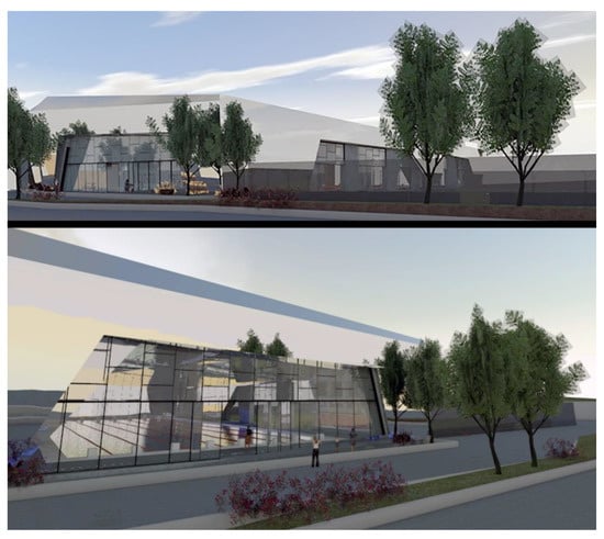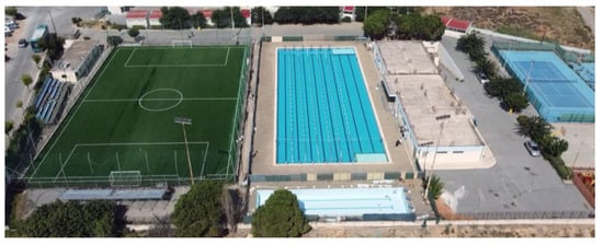 The municipal sports centre, constructed in 2002, contains a swimming pool centre, with two swimming pools, one of Olympic size (50 × 20 m) and a training one (25 × 6 m), two tennis courts, an 8 × 8 football ground and a basketball court (Figure 1). Currently, all the aforementioned facilities are outdoor facilities. The swimming pools are supported by a building which hosts the changing rooms for the swimming pool users, the administrative office, the reception, the medical service office, storage rooms and the engine room (pumps, circulators, and two oil heaters) in the building’s basement. More details on the building’s constructive elements and geometry are given in Section 5.2.2.