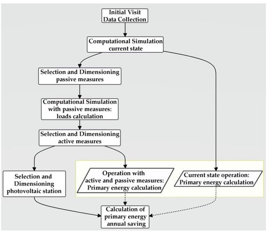 All the aforementioned calculations, both for passive and active systems, were executed computationally on the basis of annual time series with hourly average values. The process and the corresponding mathematical background are given in Section 5. The above-described methodology is given graphically in Figure 2.