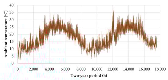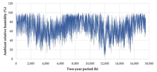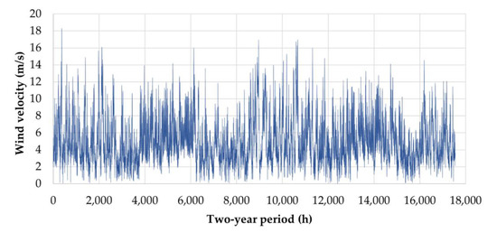 The local climate in the town of Arkalochori is characterized by rather mild winter, with ambient temperature usually between 5 °C and 15 °C, and cool summer, with ambient temperature rarely higher than 30 °C. For the purposes of this work, meteorological data were retrieved from the available climate data in the European Centre for Medium-Range Weather Forecasts (ECMWF) and for the period 2010–2020 [58] for a geographical point only 13.5 km to the north of the town. All meteorological data were downloaded in the form of annual time series with hourly average values. Indicatively, in Figure 3, Figure 4 and Figure 5, the fluctuation of the ambient temperature, the ambient relative humidity and the wind velocity at 2 m height above ground are presented for the two consecutive years, 2019 and 2020. The annual periodicity for all three magnitudes is observed in these figures. The annual average ambient temperature for 2019 and 2020 was 18.0 °C and 18.1 °C, respectively. The annual average wind velocity for 2019 and 2020 was 4.9 m/s and 5.1 m/s, respectively.
