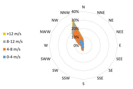 In Figure 6, the annual wind velocity rose graph for 2020 is presented, showing a northwestern wind blowing prevailing direction. This is also configured by the constant local northwest winds blowing during the summer, known as “meltemia”, which configures a cool summer climate.