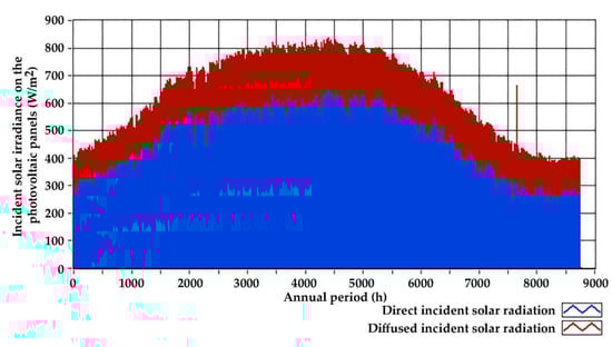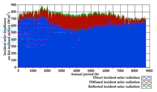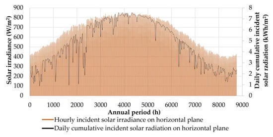 Finally, in Figure 7, the annual fluctuation for the year 2020 is presented of the average hourly incident solar irradiance and the daily cumulative solar radiation on the horizontal plane. The yearly cumulative incident solar radiation on the horizontal plane is calculated at 1675 kWh/m2, indicating the availability of considerable solar potential in the area.