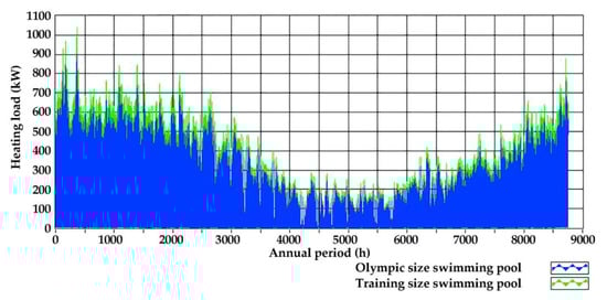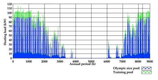 The most energy-consuming facility in the municipal sports centre is, of course, the swimming pools. As seen in Figure 1, the overall facility is outdoors, and the swimming pools are totally exposed to ambient climate conditions. No measure is currently applied for the reduction of the swimming pool heating load. On the hypothesis of normal, daily operation, the required annual diesel oil consumption for the swimming pool heating with the existing diesel oil burner (2182 kWth nominal capacity) is calculated at 307,940 L. Assuming a diesel oil procurement price of 1.2 EUR/L, the corresponding annual cost for the swimming pool heating is calculated at 369,528 EUR. This cost is too high to be afforded by the local Municipality, so, practically, the swimming pool’s centre remains inoperative during the winter period, namely from early October to late May, and it operates only for a period of roughly four months per year, depriving the local community of such an important facility.