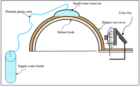 To demonstrate the advantages of the proposed system, a comparison was made with two other systems, as shown in Figure 2. In the first system, a dry helmet is considered where the heat transfer around the outer surface occurs through radiation and convection. The direction of flow depends on the temperature difference between the helmet surface, the ambient air, and the surrounding surfaces. In the second system, a wet helmet is considered where all components are assembled except the fan. In this system, the evaporative cooling effect is involved. In the proposed system under consideration, the wet helmet is ventilated by the solar fan to enhance convection and evaporative effects.
